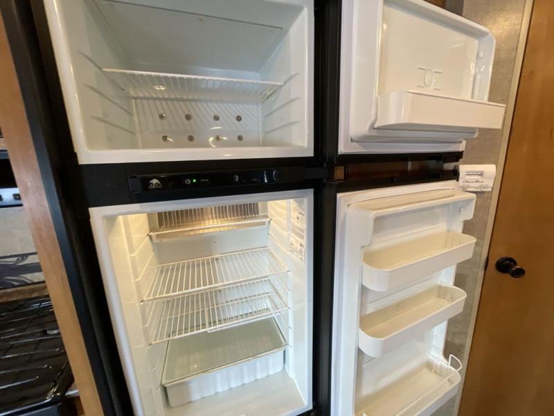 The kitchen offers a double kitchen sink, three burner range, refrigerator and a closet. On the opposite side of the trailer is a slide with a sofa and dinette. You can relax on the sofa or at the dinette and enjoy the entertainment center.