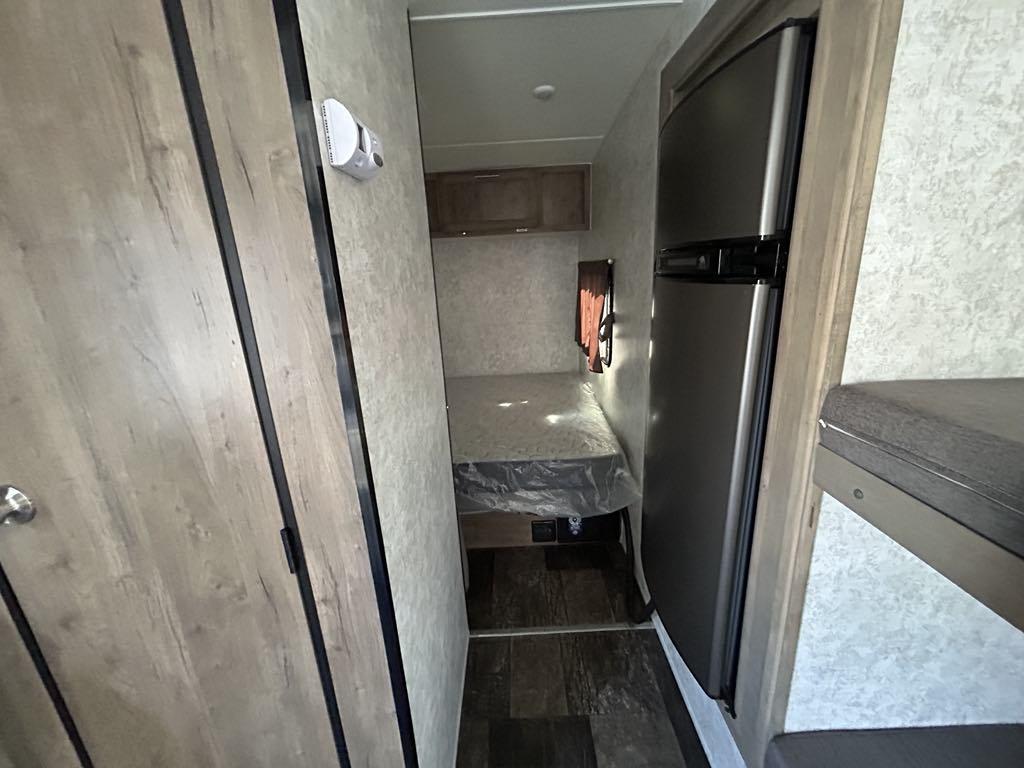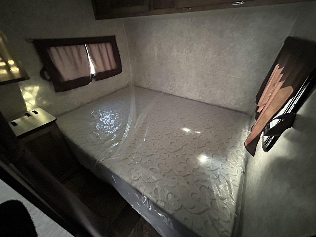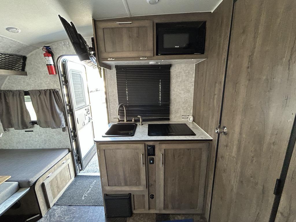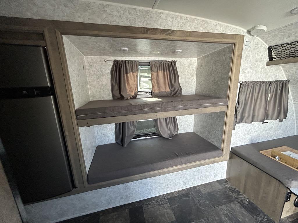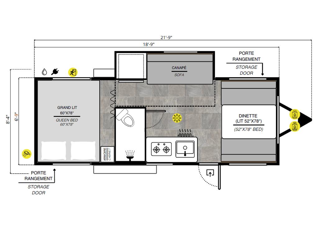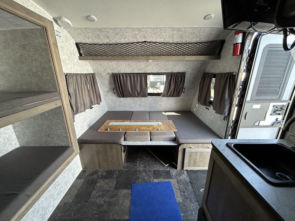 Elle comprend une dinette convertible en lit double, une cuisine pratique avec évier en inox, cuisinière à deux ronds, et réfrigérateur compact. Moustiquaires intégrées, système audio AM/FM, éclairage DEL, chauffage au propane et réservoirs d’eau de 15 gal complètent l’ensemble.