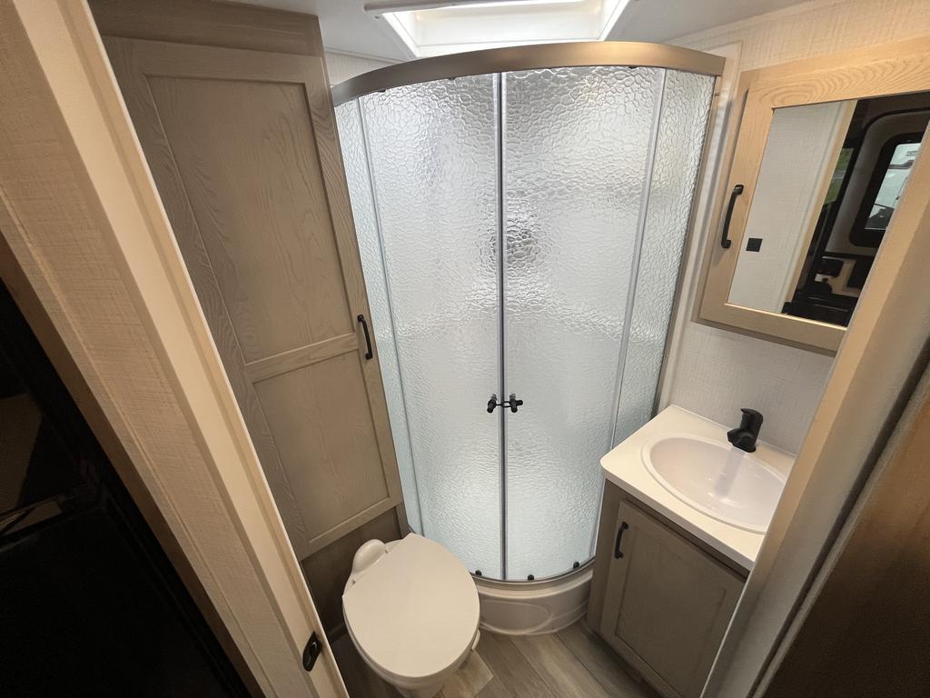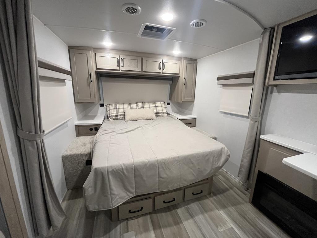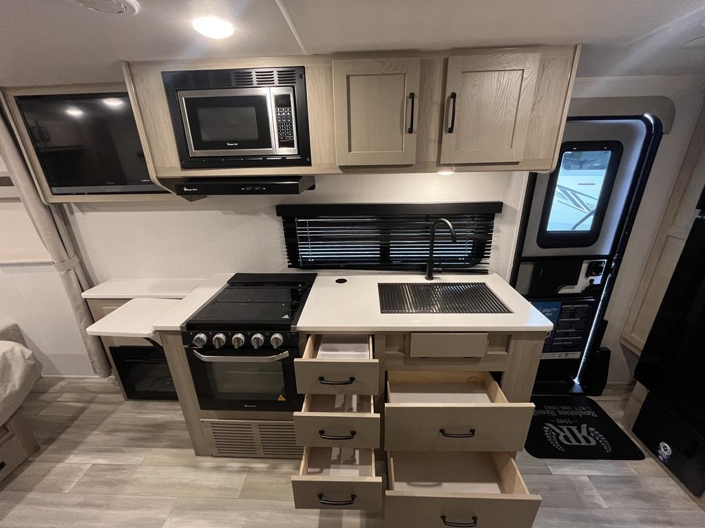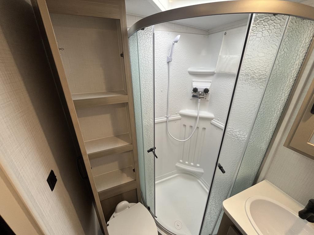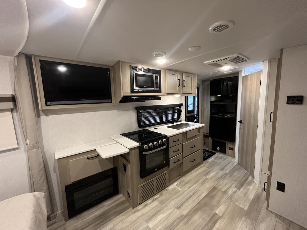 À l’intérieur, vous profitez d’un espace chaleureux pensé pour la détente : un lit queen confortable, un divan-lit pratique, une cuisine complète avec trois brûleurs et un réfrigérateur gaz/électrique, sans oublier un ventilateur Maxxair et une salle de bain bien aménagée.