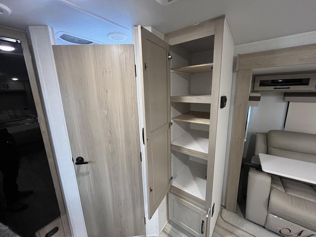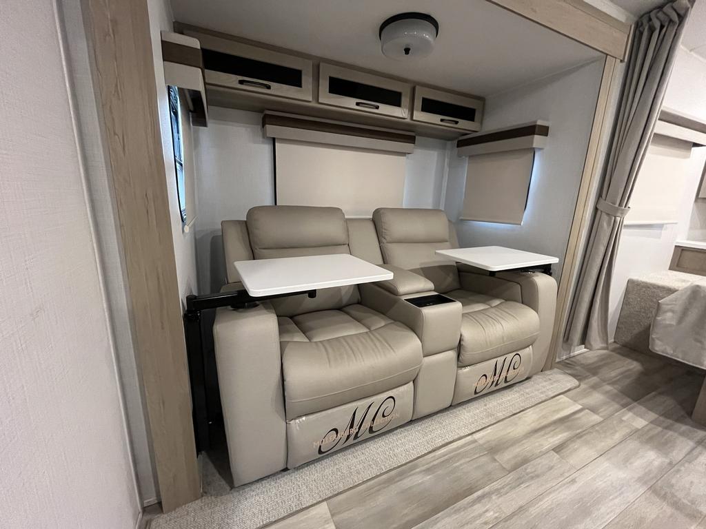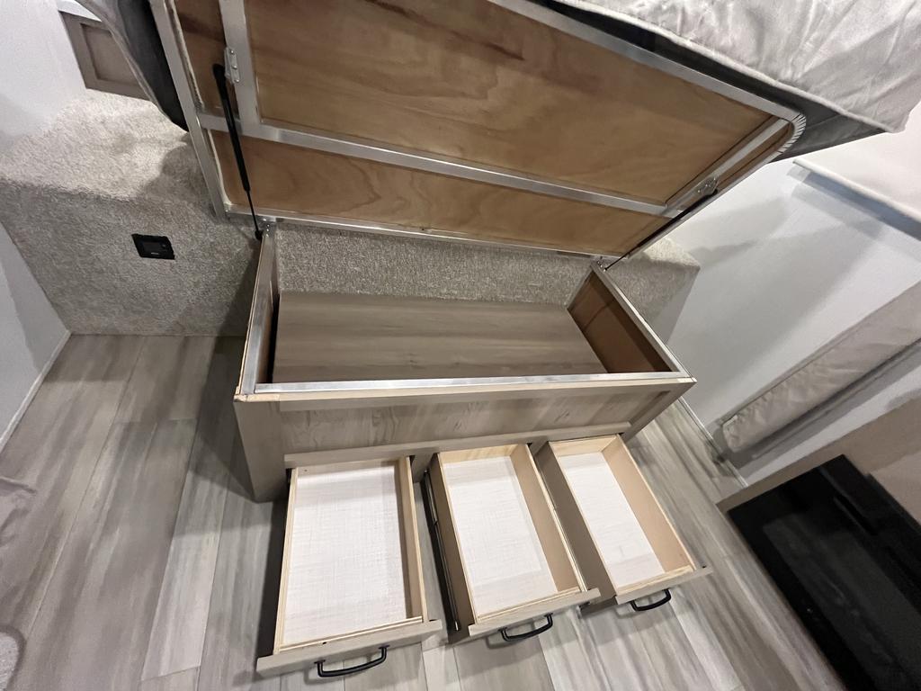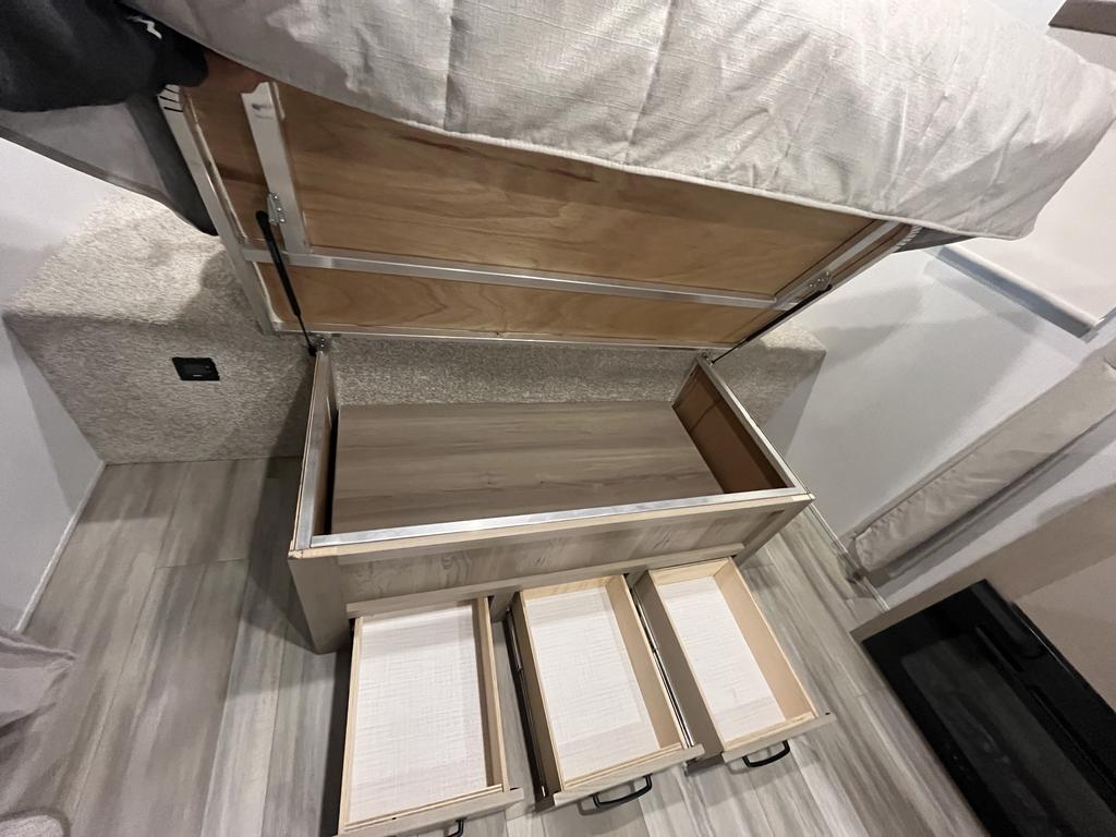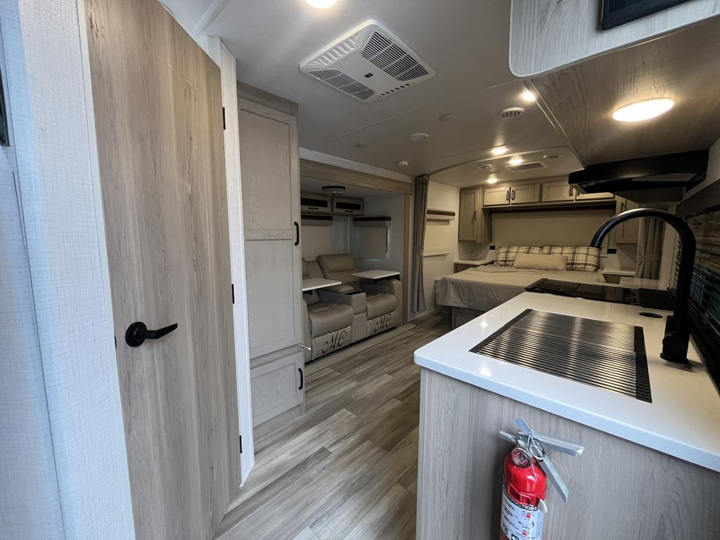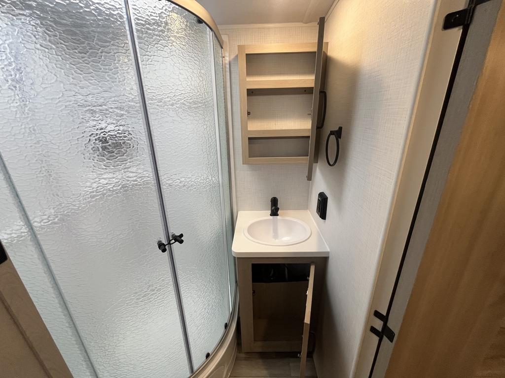À l’intérieur, vous profitez d’un espace chaleureux pensé pour la détente : un lit queen confortable, un divan-lit pratique, une cuisine complète avec trois brûleurs et un réfrigérateur gaz/électrique, sans oublier un ventilateur Maxxair et une salle de bain bien aménagée.