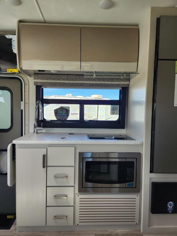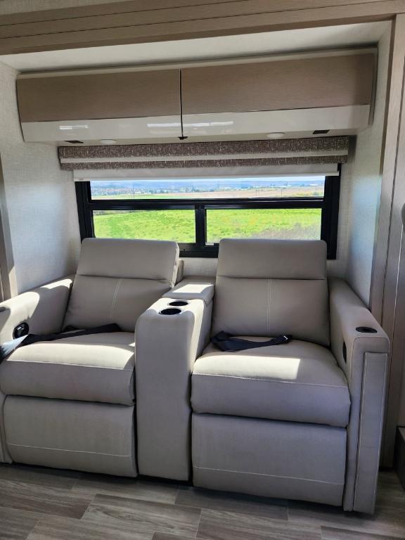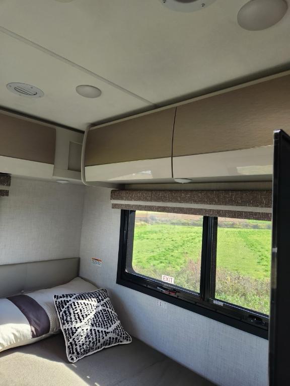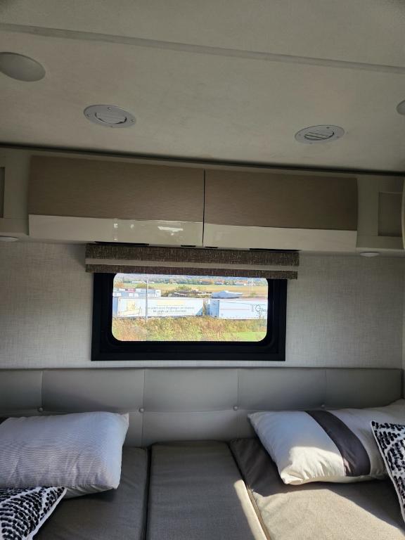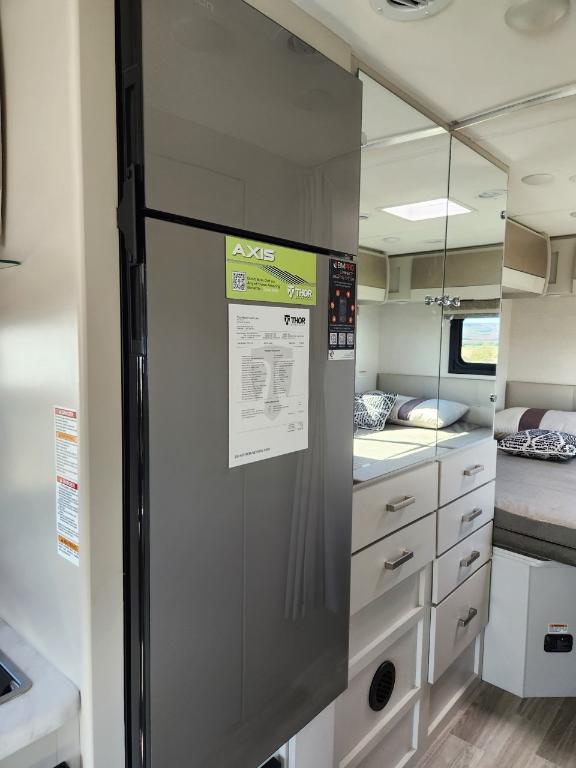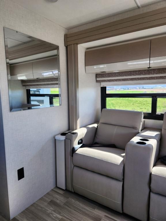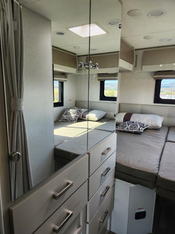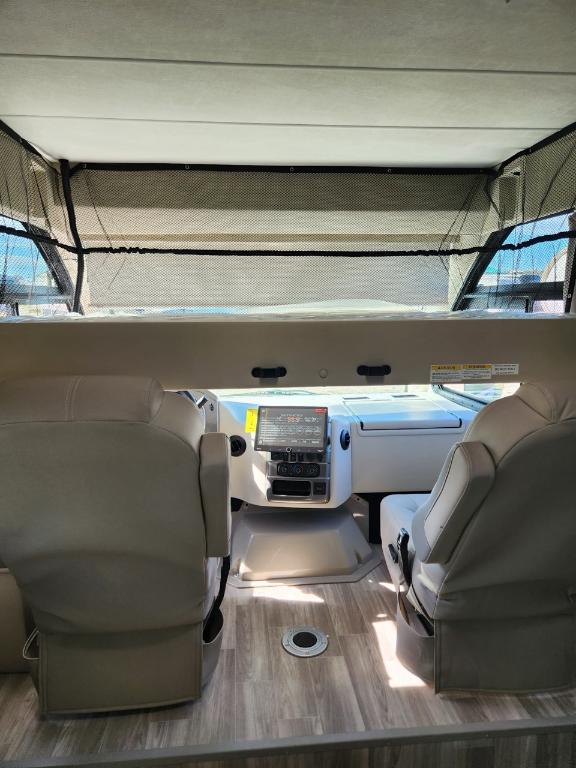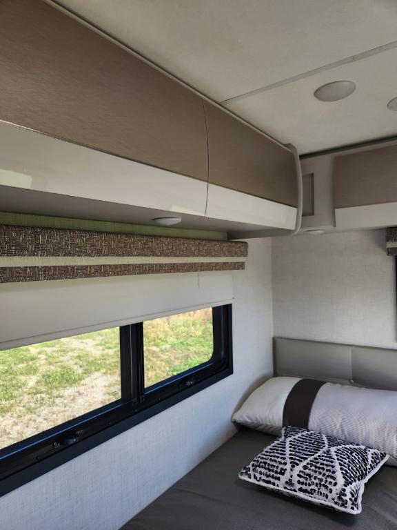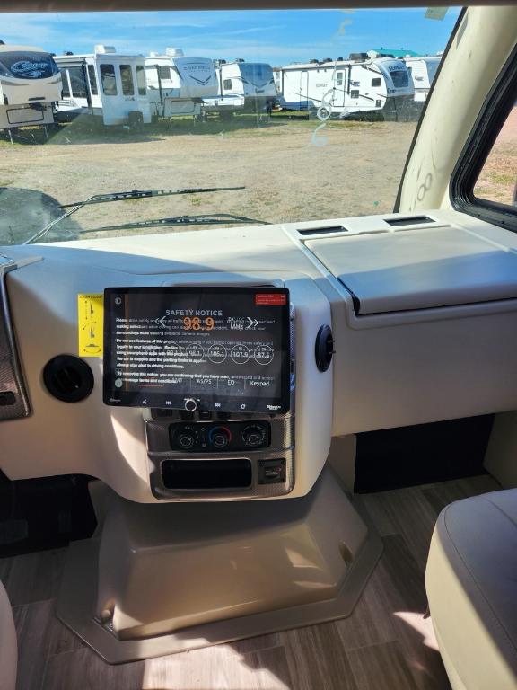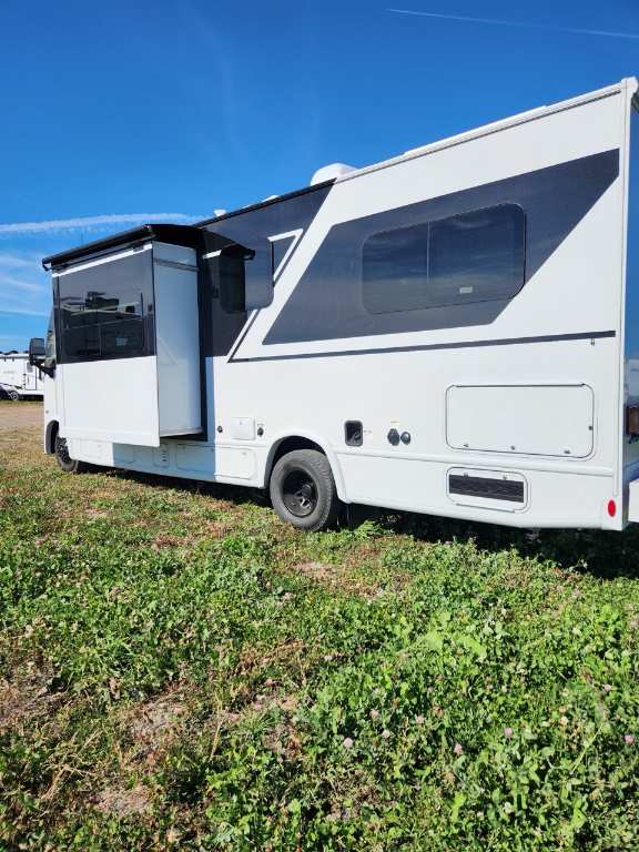 Châssis Ford Série E Attelage de remorque de 8 000 lb avec connecteur rond à 7 broches Système de stabilisation électrique Article à la une Plancher tubulaire en acier soudé Construction de cage de toit et de paroi latérale en aluminium tubulaire soudé Toiture murs et planchers stratifiés Vacu-Bond avec isolation en mousse en blocs Capuchon avant monobloc en fibre de verre Capuchon arrière supérieur en TPO Toit Crossflex™ monobloc haut de gamme HD-MAX® Extérieur avec pack graphique Peinture partielle avec simulateurs de roues Compartiments de rangement en rotomoulage éclairés Portes de compartiment à montage encastré et à rayon Store de terrasse électrique à bras latéral avec éclairage LED intégré Article à la une Auvent(s) pour chambre coulissante Échelle de toit Poignée de maintien extérieure Porte d'entrée avec serrure à pêne dormant Fenêtres noires sans cadre Intérieur Revêtements de sol en vinyle résidentiels Hauteur de plafond intérieure de 82 po Marches d'entrée en caoutchouc avec puits de marche éclairé Poignée d'entrée en métal Détecteurs de fumée de GPL et de monoxyde de carbone Extincteur Système de climatisation gainable au plafond Plafond en vinyle Armoires Coastline Grey (London Fog) avec quincaillerie et robinetterie noires Meubles de style européen à haute brillance avec quincaillerie de porte d'armoire complémentaire et charnières cachées Article à la une Canapé trois places en similicuir et table à piédestal amovible avec porte-gobelets Chargeur de téléphone sans fil avec prise USB Ceintures de sécurité pour les passagers dans certaines zones Éclairage LED Stores enrouleurs pour fenêtres Glissières de tiroir à roulement à billes en métal à extension complète et fermeture en douceur.