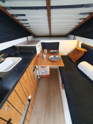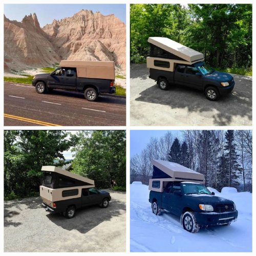 Camper porté fabriqué en 2022 par un ébéniste qualifié: • Lit dans la capucine avec VRAI matelas double • Toit relevable pour tenir debout avec toile de vinyle sur mesure épaisse avec des moustiquaires • Pompe à eau 12V, reliée à un réservoir d’eau permanent de 80L • Evier de cuisine et robinet (eau froide) • Poêle à propane 2 brûleurs • Chauffage portable au propane • Batterie (CER31S, 12V, 925 ADF - neuve 05/2025) • Convertisseur de courant 110V/12V et disjoncteurs • Détecteur de fumée • Prise USB et 12V • Glacière portable 110V/12V • Comptoir de cuisine en stratifié • Placard et nécessaire de cuisine • Table à manger amovible • Banquette avec bacs avec rangement en dessous + convertible en un deuxième • Douchette extérieure • Caissette WC portative Détails sur la fabrication artisanale : • Structure : bois, isolation de styromousse haute densité, et entièrement recouverte de fibre de verre + gel coat. Muni de verins pour lever le toit en angle et offrir de la hauteur à l’intérieur • Toile : vinyl, de qualité, sur mesure, avec fenêtres à moustiquaires Camper seul estimé à $27 000 par organisme certifié (pour vente et assurance) en Mai 2024. Si intéressé, le document de l’analyse sera fourni. Véhicule : • Toyota Tundra 2000 • Sr5 Access Cad 4WD • 4 portes 5 places • Moteur 4.7L V8 DOHC 32V • Essence réservoir 100L • 322 XXX km • 4x4 • Frame changé lors du rappel Toyota • Régulateur de vitesse • Carrosserie restaurée et renforcée • Peinture Raptor noir mat faite en 2022 • Consommation env. 15L/100 Mécanique et entretien (factures à l’appui) : • Freins avant (plaquettes + mâchoires) 05/2024 • Bougies + Gasket 10/2023 • Joints essieu arrière + freins arrières 06/2023 • 4 pneus 4 saisons 05/2023 (pneus avant + arrière D changé 10/2024) • Ligne d’échappement du moteur au silencieux avec catalyseur 07/2023 • Différentiel et système 4x4 03/2023 • Suspension avant 09/2022 • Câble de shifter 09/2024 • Remplacement joint rotule avant droite 09/2024 • Lames ressort arrières 05/2025 • Vidange faite 05/2025 • Front upper and lower ball joints 10/2025 • Tie rod ends and support bearing 10/2025 • Traitement antirouille chaque année A savoir : • Vidange à prévoir • Voyant moteur allumé (fuite d'échappement) • Cadre inférieur porte conducteur rouillé Dimensions : • Longueur 18’4 pieds (5.60m) • Largeur 6’4 pieds (1.95m) • Hauteur (campeur fermé) 7’9 pieds (2.40m) • Poids du campeur environ 700kg / 1600 lds (vide) • Poids total (campeur plein + pick-up) environ 3 tonnes (6600 lds)