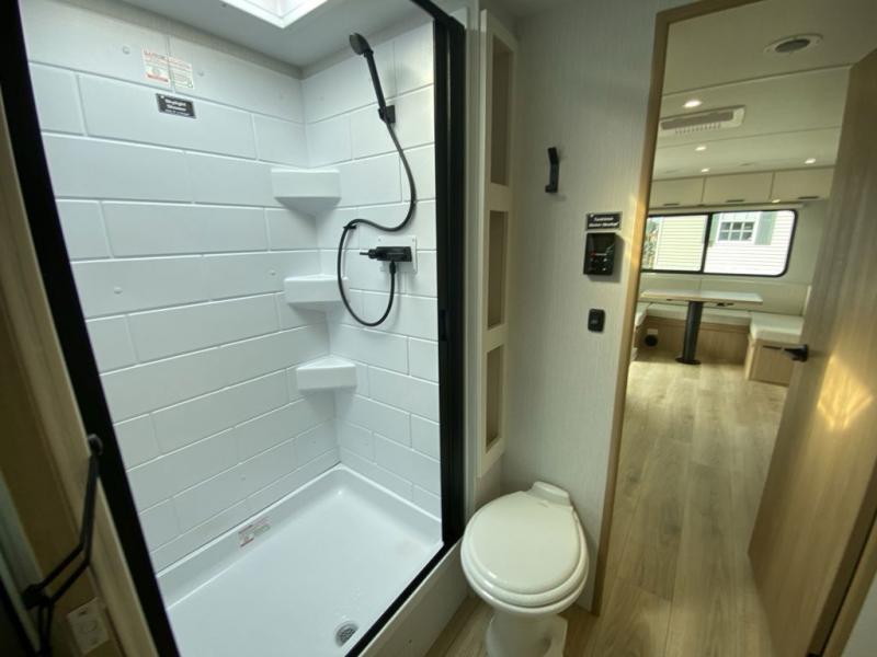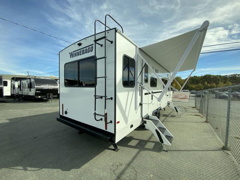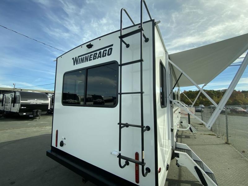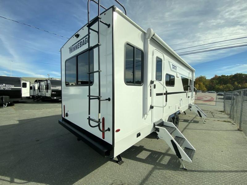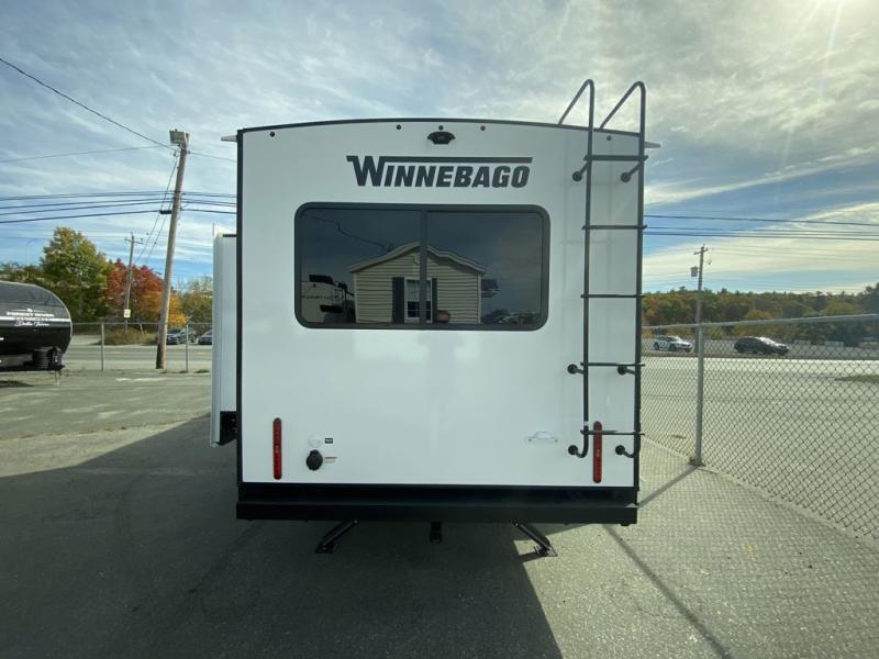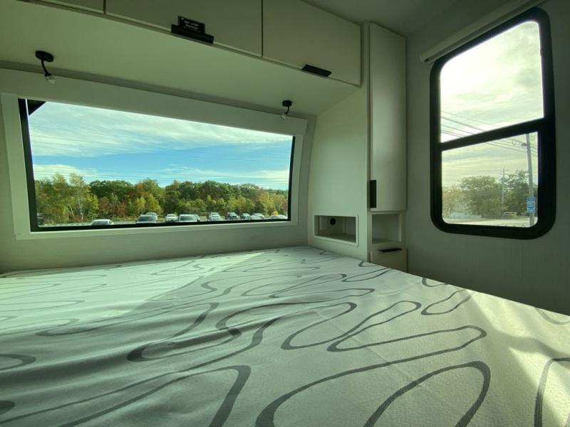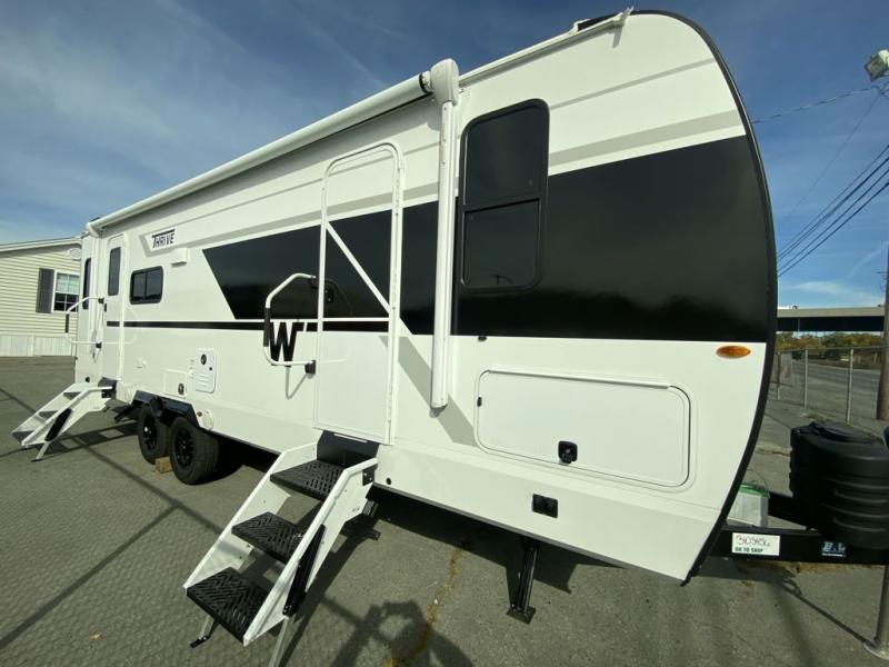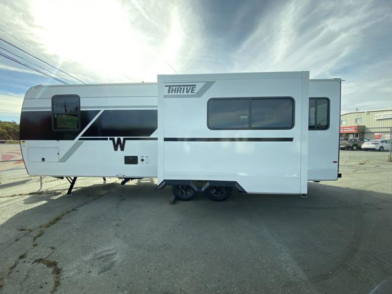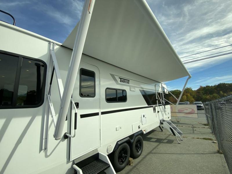 With any Thrive travel trailer by Winnebago, you can camp with functionality, comfort, and convenience! The large front viewing window with strike guard will be the first thing that catches your eye, and the fiberglass sidewalls with Azdel Onboard provide a durable trailer made to last. There is also an exterior ladder, along with front radius profile lights, power stabilizer jacks, and a powered awning with LED lighting to name a few exterior features. You will stay powered up by the 30-amp power cord and 200-watt solar panel, plus there is a tankless water heater for endless hot showers. Inside, you'll love the custom Winnebago furniture, carpetless side outs, molded fiberglass countertops, and residential recessed ceiling lights to keep your space well lit!