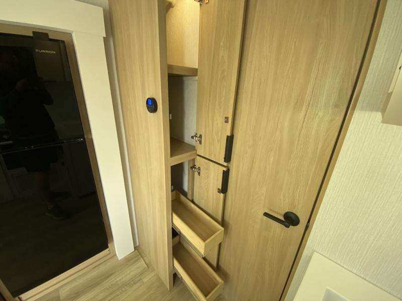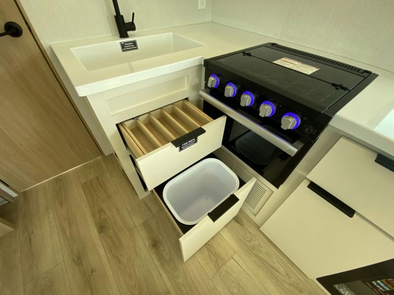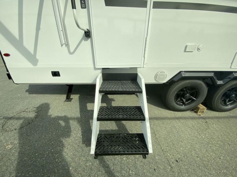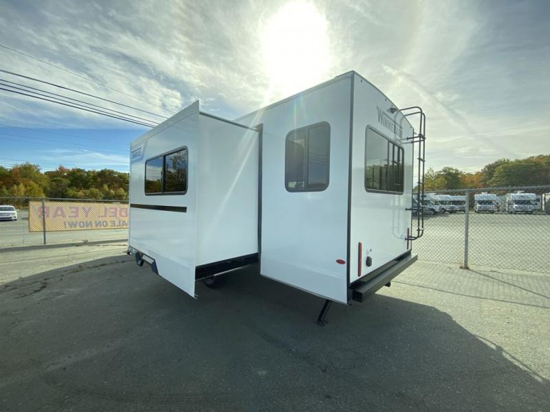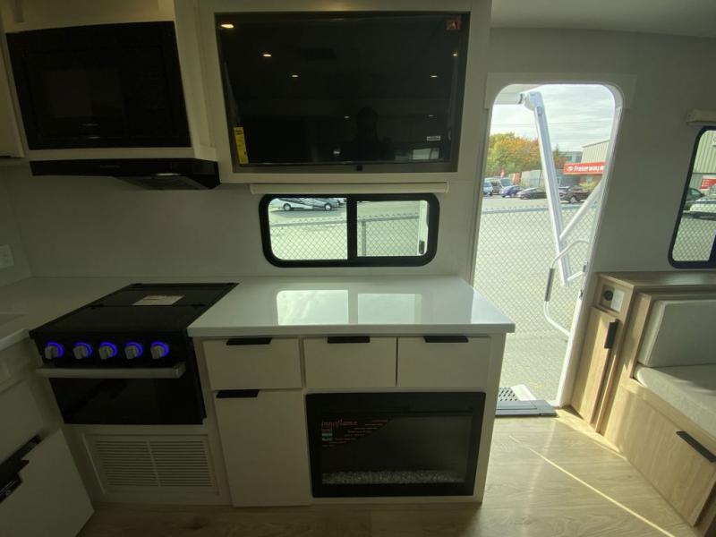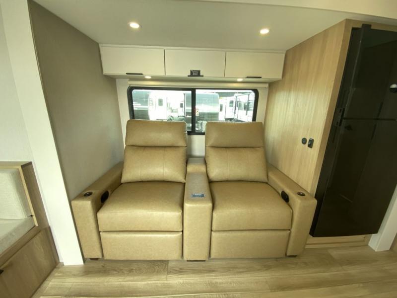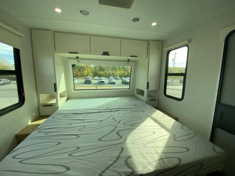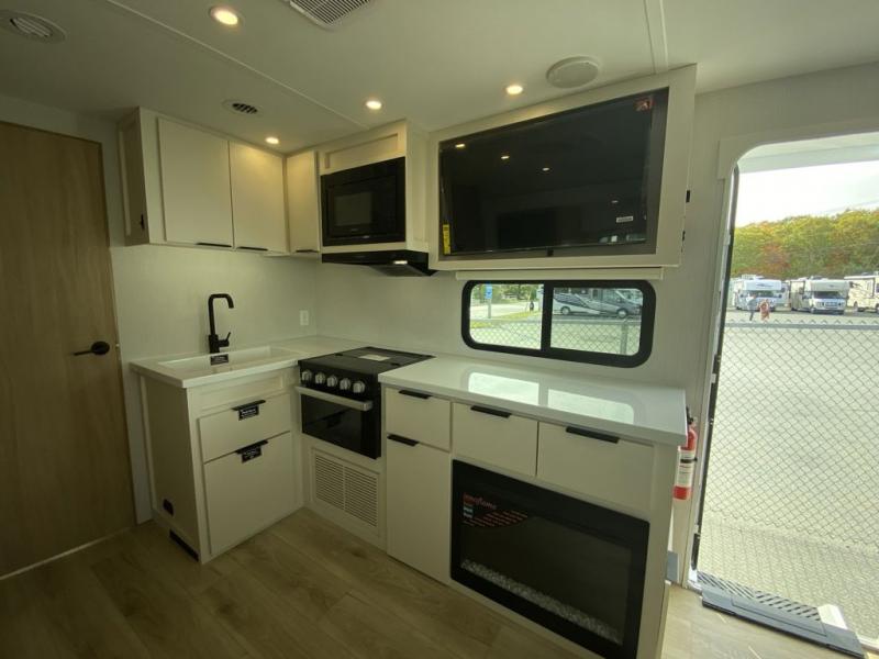 The rear living space of this travel trailer offers a spacious and welcoming layout, perfect for relaxing or entertaining after a day of adventure. In the main area three is a large 42" x 86" U-shaped dinette, with plenty of room for meals, games or gathering to share stories. Beside there is theater seating located in the slide-out that adds extra comfort and seating space. Across, a cozy fireplace and TV making this the ideal spot for winding down in the evenings. The kitchen and appliances allow the chef to easily move around in the spacious living area. Moving forward, a pass-through bathroom adds convenience and privacy, leading to the front private bedroom. Here you'll find a spacious 66" x 80" Olympic Queen Bed, on each side wardrobes for ample storage. The bedroom also features a second exterior entry door, providing easy access without disturbing the main living area.